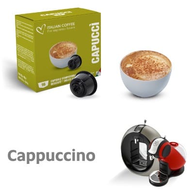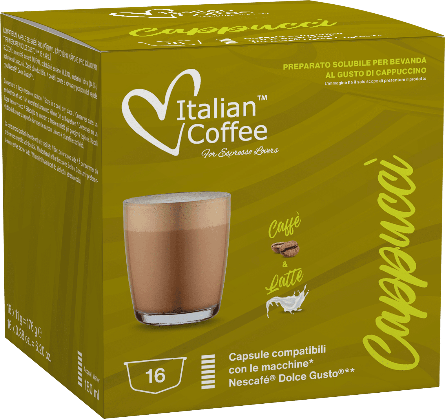 Čo je to cappuccino? Je to kombinácia lahodnej kávy a napeneného mlieka. Kto mal možnosť vypiť tento jedinečný nápoj aspoň raz, určite bude túto chuť hľadať znova. Kapsuly kompatibilné so systémom Dolce Gusto® obsahujú vybrané kávové zrná. Cappuccino, ktoré ponúkame, neobsahuje cukor. Kapsuly kompatibilné so systémom Dolce Gusto® obsahujú iba prírodné zložky. Z jedného balenia si môžete pripraviť až 16 šálok cappuccina.
