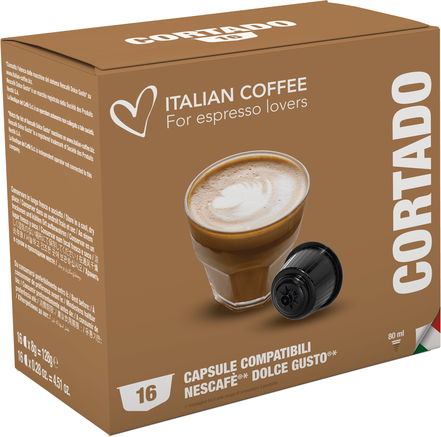 Cortado je káva, ktorá pochádza z horúceho Španielska. Chuť je trochu podobná talianskemu Espresso Macchiato. Kapsula Dolce Gusto obsahuje kávu s výraznou arómou s tónmi mandlí a pekanových orechov. Na povrchu tohto nálevu sa vytvára oriešková a ochutená pena, vďaka ktorej je jeho pitie skutočným potešením. Jedna kapsula Dolce Gusto stačí na prípravu jednej šálky tohto jedinečného nápoja. Cortado je dokonalou kombináciou Arabicy a Robusty, dvoch najznámejších druhov kávy na svete.