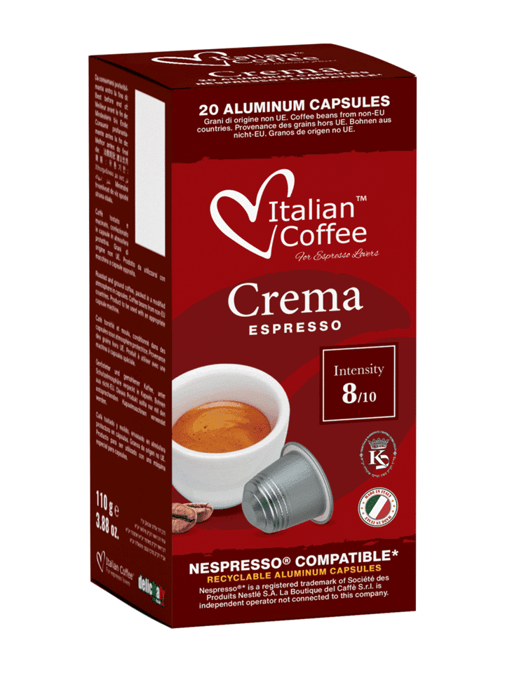 Kolekciu 20 hliníkových kapsúl s praženou a mletou kávou Crema Espresso si určite zamilujú gurmáni intenzívnej kávy. Jemná talianska káva Crema Espresso je ideálna ako príjemný nápoj ráno. Káva bola pripravená zo starostlivo vybraných kávových zŕn pod dohľadom majstrov. Kapsuly kompatibilné so systémom Nespresso. Talianska káva Crema Espresso je zmesou kvalitnej Arabicy a Robusty. Táto kombinácia nám dodáva plnú chuť s vysokou intenzitou. Káva je ideálna ráno pre dobrý začiatok dňa.