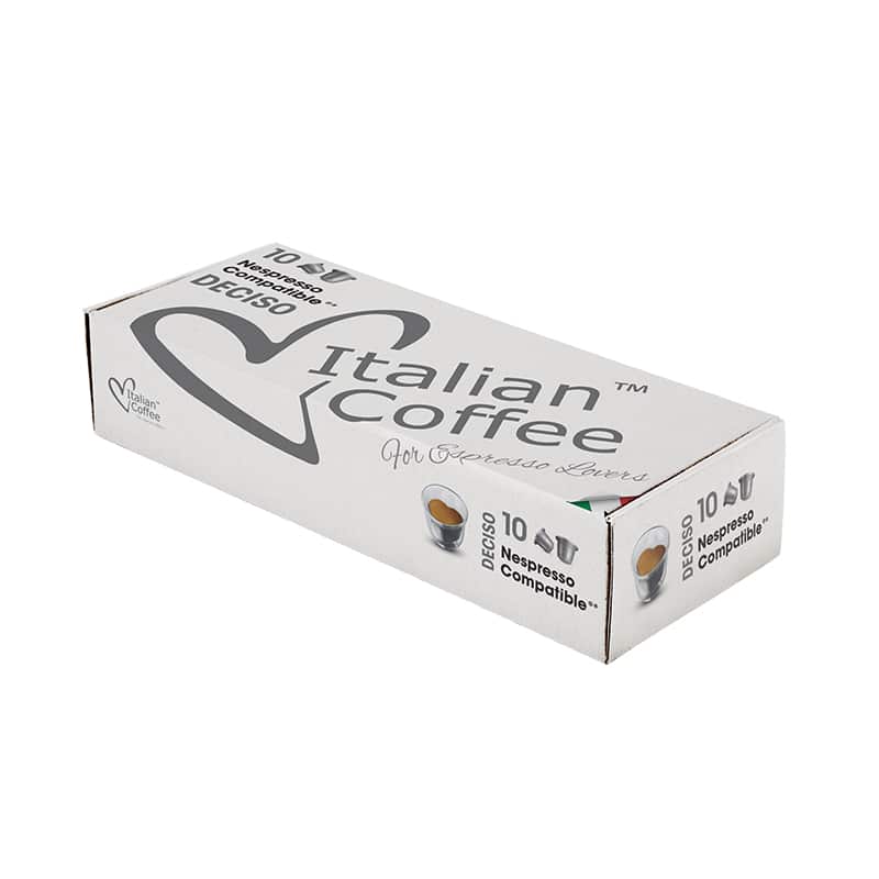 Naša nová zmes „Deciso“ je mimoriadne intenzívna. Talianska káva Deciso je káva s dlhotrvajúcou dochuťou. Kapsuly kompatibilné so systémom Nespresso® vám umožnia pripraviť si vynikajúce espresso doma. Stojí za to siahnuť po tejto káve ráno, keď sa potrebujeme zobudiť. Nápoj má veľa kofeínu a rýchlo vás postaví na nohy. Kapsuly kompatibilné so systémom Nespresso® obsahujú kvalitnú zmes Arabicy a Robusty.