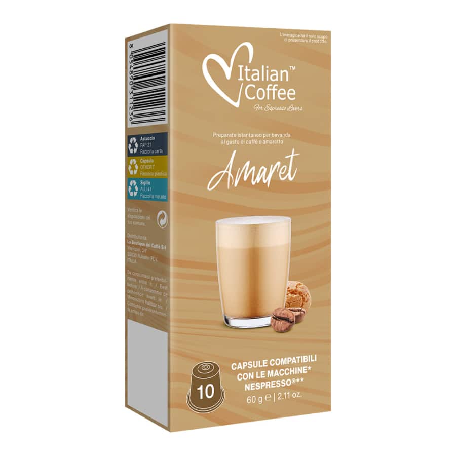 Amaretto je káva s chuťou klasického talianskeho alkoholického likéru s rovnakým názvom. Zmes použitá na prípravu tejto infúzie má veľmi hustú konzistenciu. Vyznačuje sa tiež strednou intenzitou. Má veľmi jemnú arómu. Kapsuly Amaretto kompatibilné® s Nespressom obsahujú zmes Arabica (30 percent) a Robusta (70 percent). Kávové zrná pochádzajú z Ghany, Kolumbie a Vietnamu. Nálev má veľmi jemnú chuť s tónmi mandlí. Neostáva nič iné, len si to užívať. Kávový nápoj Amaretto je zmes s jemnou, mierne horkou chuťou a jemnou arómou likéru Amaretto vyrobená na báze mandlí. 10 kapsúl kompatibilných so systémom Nespresso. Každá porcia mletej kávy, určená na varenie v kapsulových strojoch Nespresso, je balená v špeciálnych hermetických kapsulách, ktoré vám umožňujú zachovať plné vlastnosti a kvality kávy aj po mnohých mesiacoch, čo zaručuje vynikajúcu chuť a vôňu.