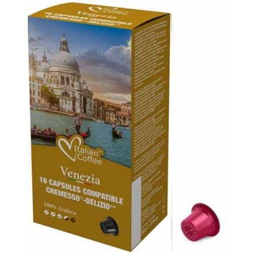Benátky sú talianske mesto, do ktorého milovníci radi chodia. Obdivujú okrem iného Most vzdychov či Canal Grande. Ak chcete aj vy na chvíľu pocítiť jedinečnú atmosféru Benátok, odporúčame vám kávu inšpirovanú týmto miestom. Určite sa vám bude páčiť jeho harmonická chuť a jemná aróma. V jeho vôni môžete cítiť jemné tóny spáleného dreva. Kapsuly sú kompatibilné so systémom Cremesso-Delizio®. Po uvarení sa na povrchu vytvorí hustá a krémová pena. Odporúčame vám to vyskúšať! Kávové kapsuly VENEZIA sa vyznačujú hodvábnou sladkosťou chuti v kombinácii s pomaly sa uvoľňujúcimi tónmi praženého dreva. Je to vyvážená zmes najkvalitnejších, chuťovo ušľachtilých odrôd zŕn Arabica s tými, ktoré jej dodávajú charakter.
