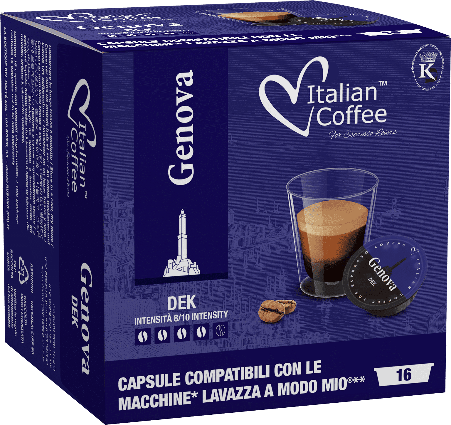V našom obchode nájdete široký výber kapsúl Lavazza a Modo Mio do kávovarov. Ponúkame aj kávu bez kofeínu. Jedným z nich je Genova Decaffeinato. Je to typická talianska káva, jej názov odkazuje na prístavné mesto Janov, ktoré je pre turistov mimoriadne atraktívne. Genova Decaffeinato neobsahuje kofeín, takže ho môžu bez obáv piť aj deti a starší ľudia. Okrem nedostatku kofeínu nie je v žiadnom prípade horší ako tradičná čierna káva. Nálev sa vyznačuje veľmi jemnou a krémovou chuťou. Môžete si ho vychutnať bez ohľadu na dennú dobu.